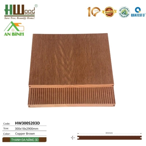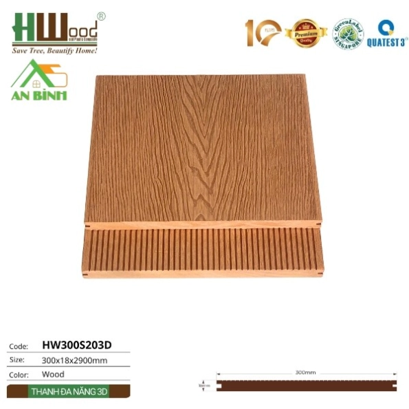 Thanh đa năng HW300S203D là sản phẩm cao cấp của HWOOD VIỆT NAM, được sản xuất từ gỗ nhựa composite – sự kết hợp hoàn hảo giữa bột gỗ tự nhiên và nhựa PVC cao cấp.