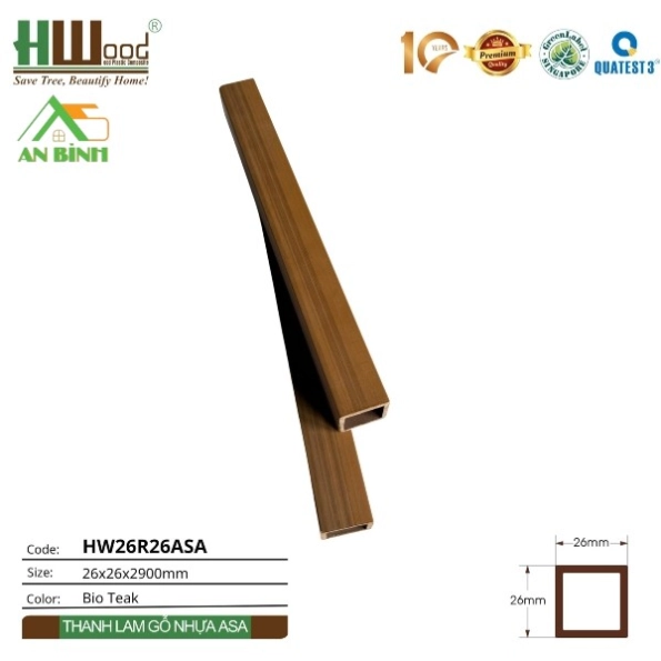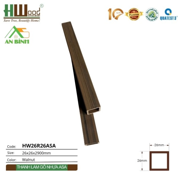 Trong thiết kế ngoại thất ngày nay, việc tìm kiếm vật liệu bền đẹp, chống chịu tốt và thân thiện môi trường là ưu tiên hàng đầu. Thanh lam gỗ nhựa HW26R26ASA của Hwood Việt Nam ra đời như một bước đột phá, kết hợp giữa công nghệ phủ ASA tiên tiến và vẻ đẹp tự nhiên của gỗ, mang đến giải pháp toàn diện cho mọi công trình. Với thiết kế vuông nhỏ tinh tế (26x26x2900mm), sản phẩm không chỉ đáp ứng yêu cầu thẩm mỹ mà còn đảm bảo độ bền vượt trội, được các kiến trúc sư và chủ đầu tư tin dùng trong các dự án ngoại thất cao cấp.