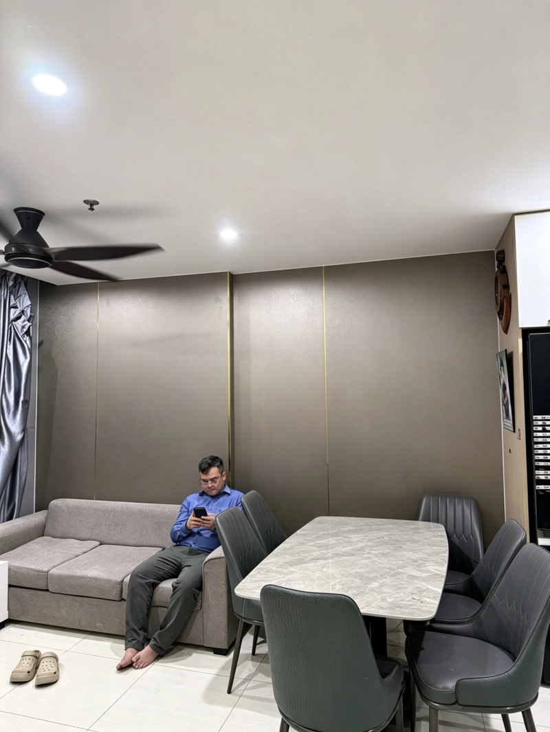 Các khu vực tường khác sử dụng PVC giả đá kết hợp tấm than tre, mang lại vẻ đẹp thanh lịch, dễ vệ sinh và có độ bền cao. Đây là giải pháp tối ưu cho căn hộ hiện đại, giúp tiết kiệm chi phí nhưng vẫn đảm bảo tính thẩm mỹ.