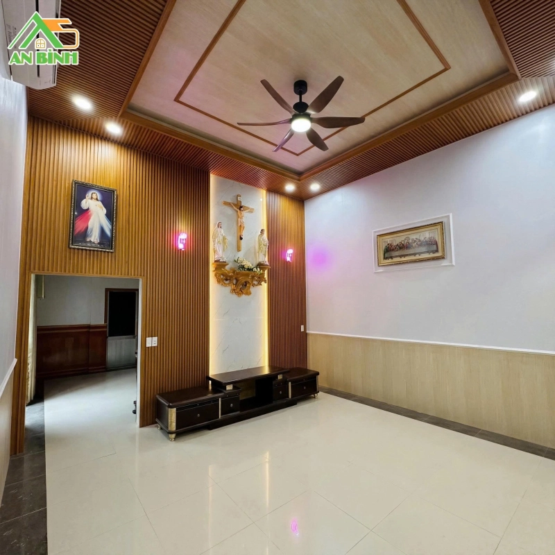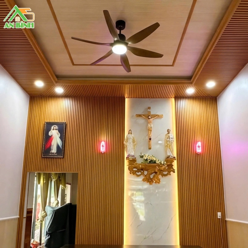 Khu vực bàn thờ được xử lý khéo léo với tấm lam sóng kết hợp PVC giả đá, vừa đảm bảo sự trang nghiêm cần thiết, vừa tạo điểm nhấn nổi bật.