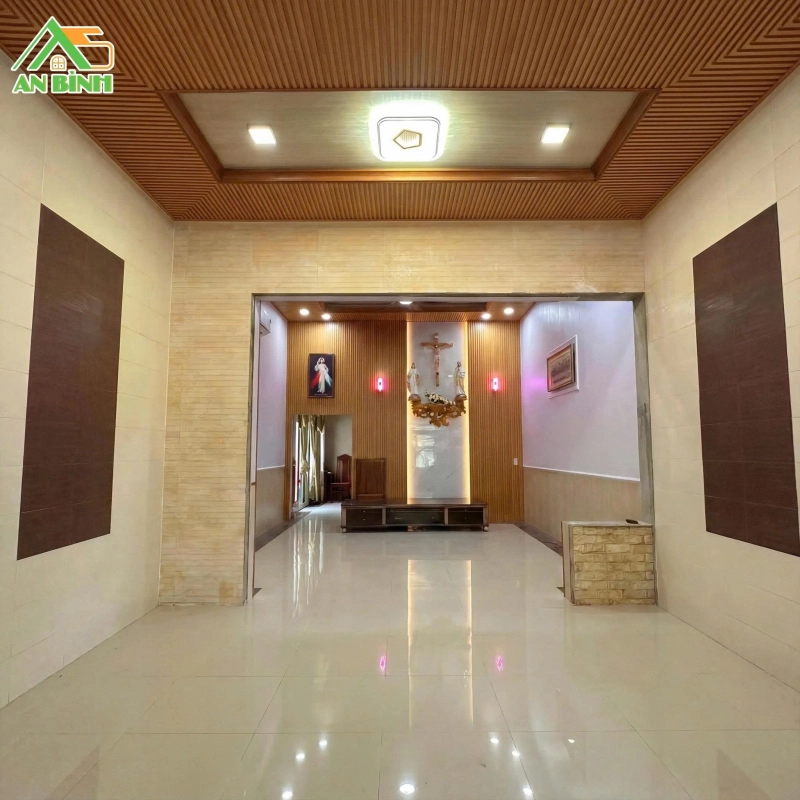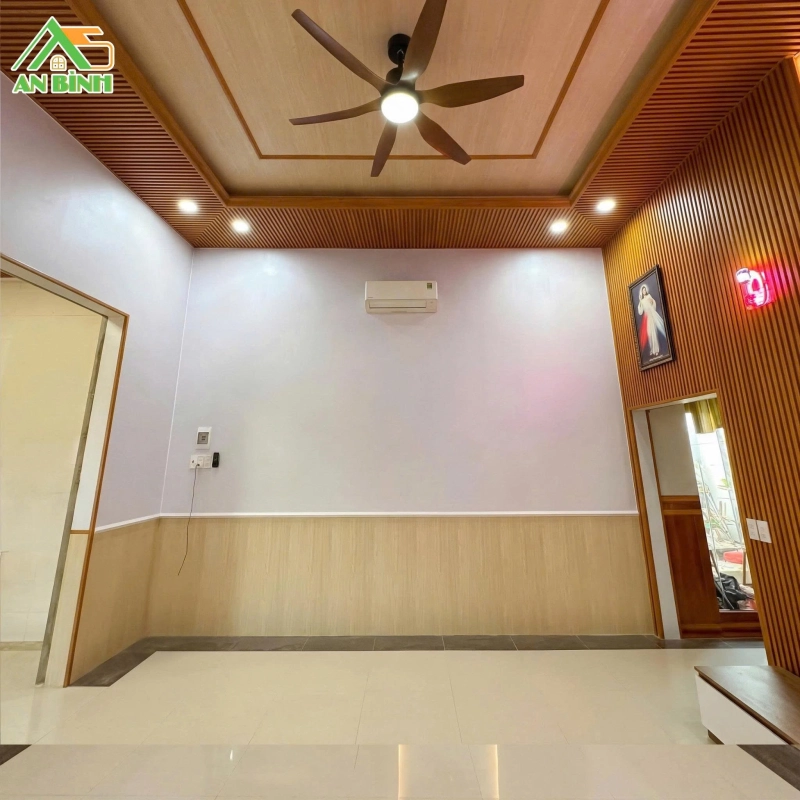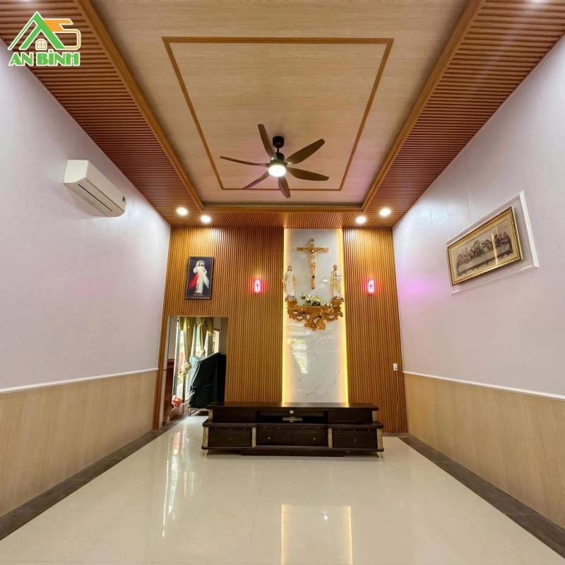 Trần được thiết kế giật 1 cấp, giúp tăng cảm giác thông thoáng và mở rộng không gian. Đội ngũ An Bình sử dụng tấm ốp Nano phẳng làm nền chủ đạo, kết hợp viền xung quanh bằng lam sóng và phào chỉ đồng bộ.