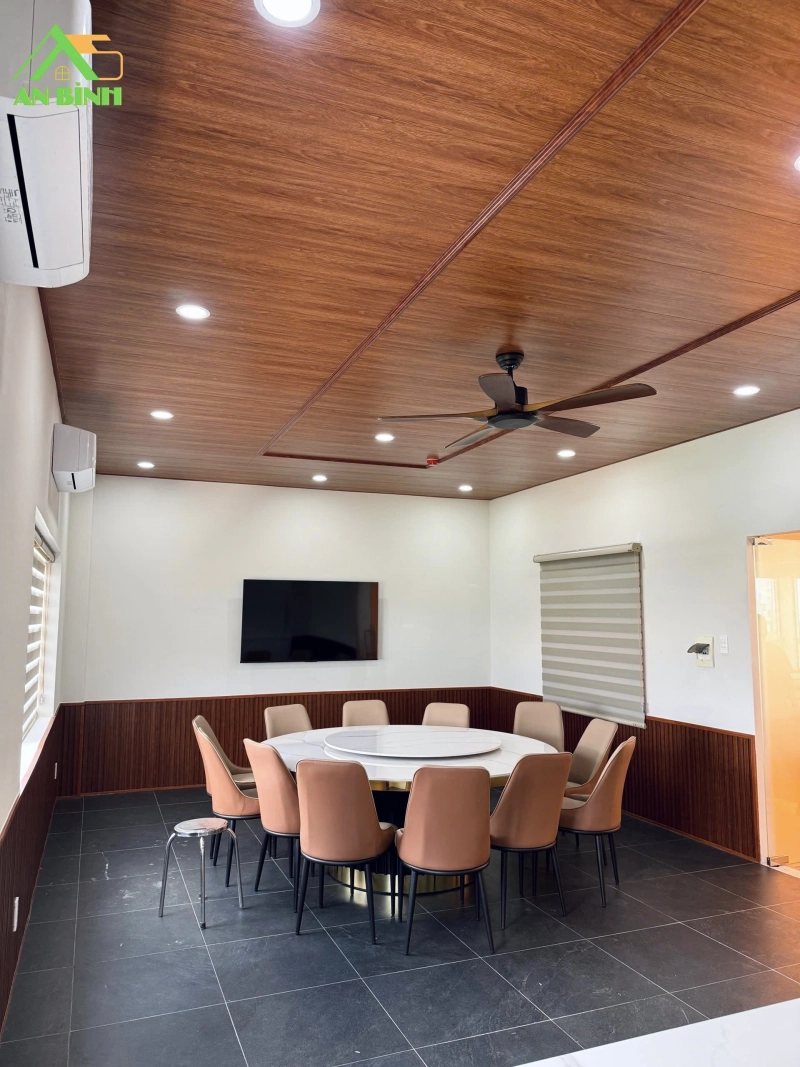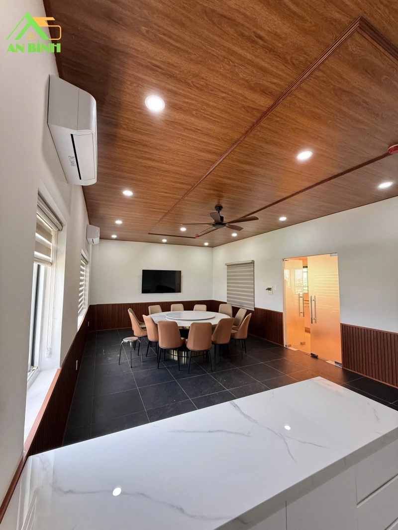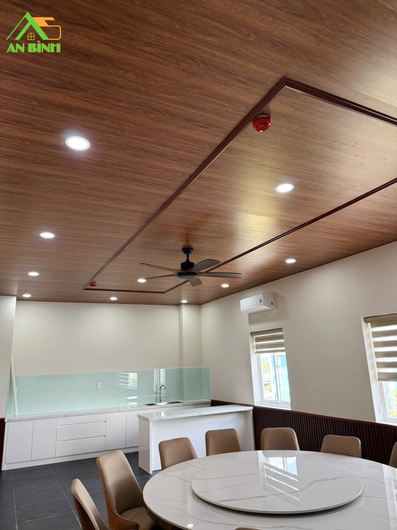 Gỗ Nhựa An Bình tiếp tục hoàn thiện hạng mục thi công trần và vách lamri cho khu bếp ăn văn phòng tại Quận 9, mang đến không gian hiện đại, ấm cúng và đầy tính thẩm mỹ cho môi trường làm việc.